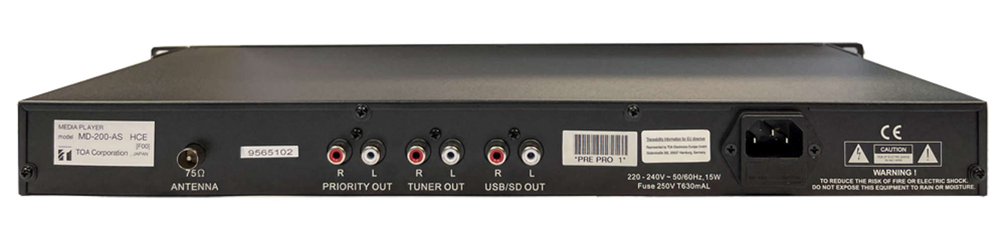 TOA MD-200 is a media player with digital processing FM radio tuner. It has the capability to store up to 30 receiving channels, each of which can be recalled by one-touch operation. The unit have a MP3 USB, SD Card MP3 playable. The MD-200 can be mounted on an EIA equipment rack.